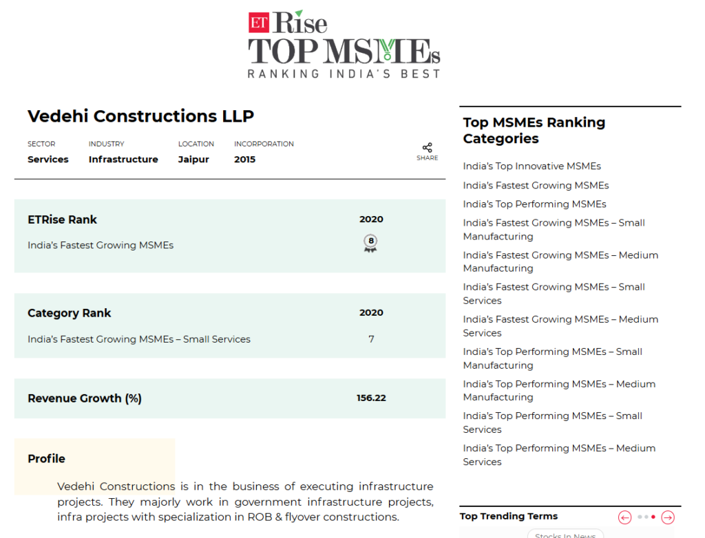 Only company from Rajasthan State to receive economic times award for fastest growing company PAN India in MSME segment.